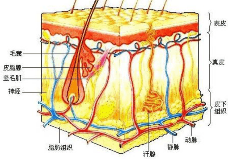 皮膚的主要結(jié)構(gòu)包括表皮,真皮,皮下組織。表皮又包括小五層,即角質(zhì)層、透明層、顆粒層、有棘層基底層,表皮生長周期一般28天左右。真皮由致密的結(jié)締組織組成。其內(nèi)部分布各種結(jié)締組織細(xì)胞和大量的膠原纖維、彈性纖維,使皮膚既有彈性又有韌性。如下圖。